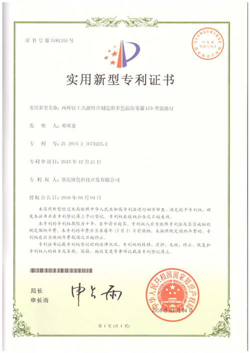 我司研發(fā)的“兩種以上光源組合制造的多色溫防霧霾LED智能路燈”于2015年12月21日向國(guó)家專(zhuān)利局申報(bào)了專(zhuān)利。2016年5月4日經(jīng)國(guó)家專(zhuān)利局批準(zhǔn)獲得了專(zhuān)利授權(quán)(專(zhuān)利號(hào):2015 2 1071225.2)。獲此專(zhuān)利,激發(fā)了全公司員工科技創(chuàng)新的熱情。我司將再接再厲,繼續(xù)做好科技創(chuàng)新工作,推陳出新,獲得更多專(zhuān)利。