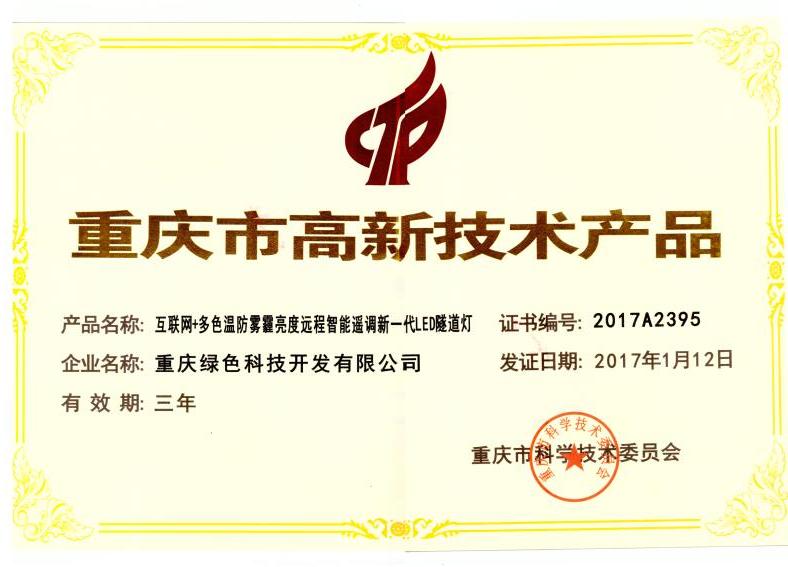 我司研發(fā)、制造的“互聯(lián)網+多色溫防霧霾亮度遠程智能遙調新一代LED隧道燈”榮獲市高新技術產品認證