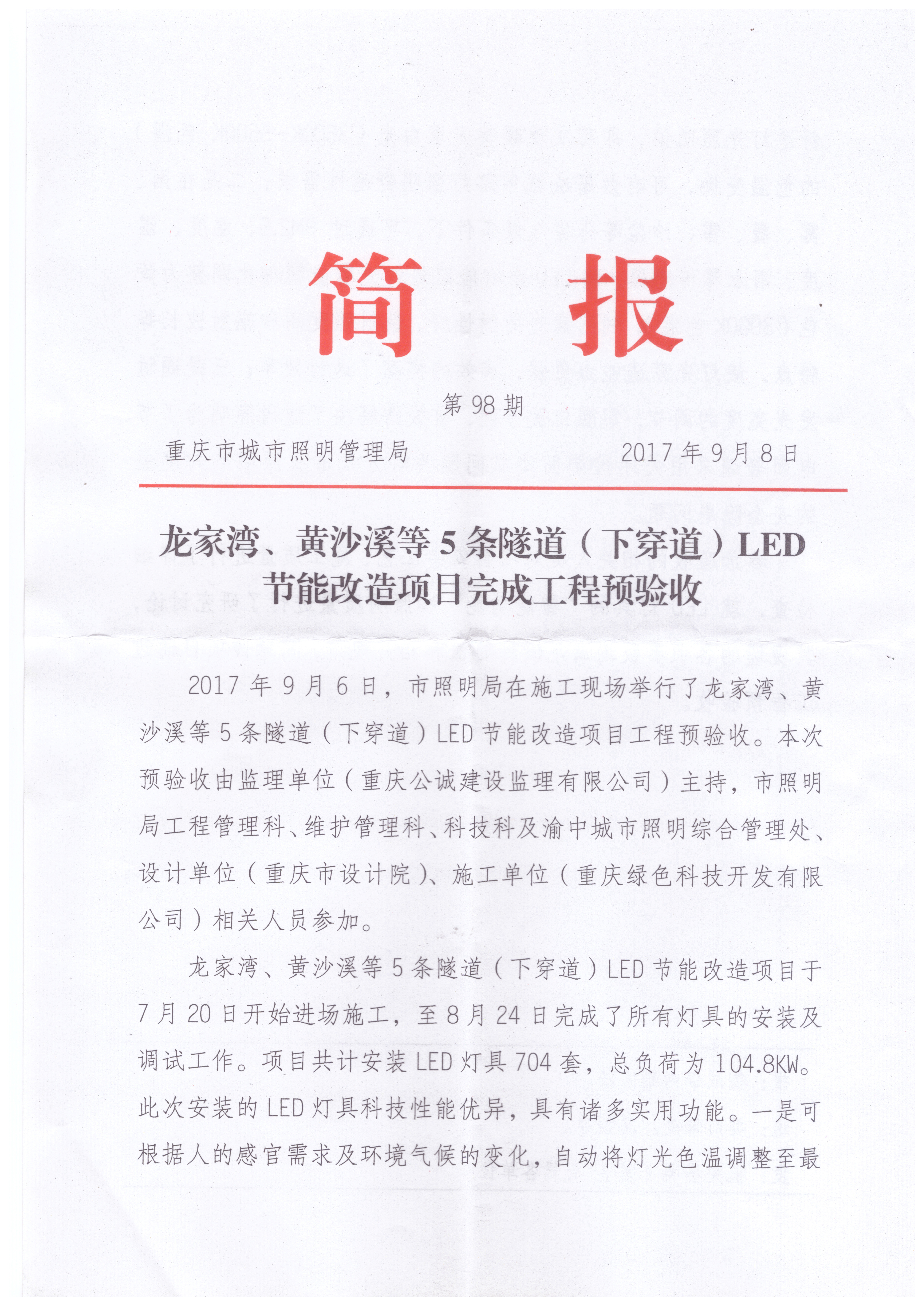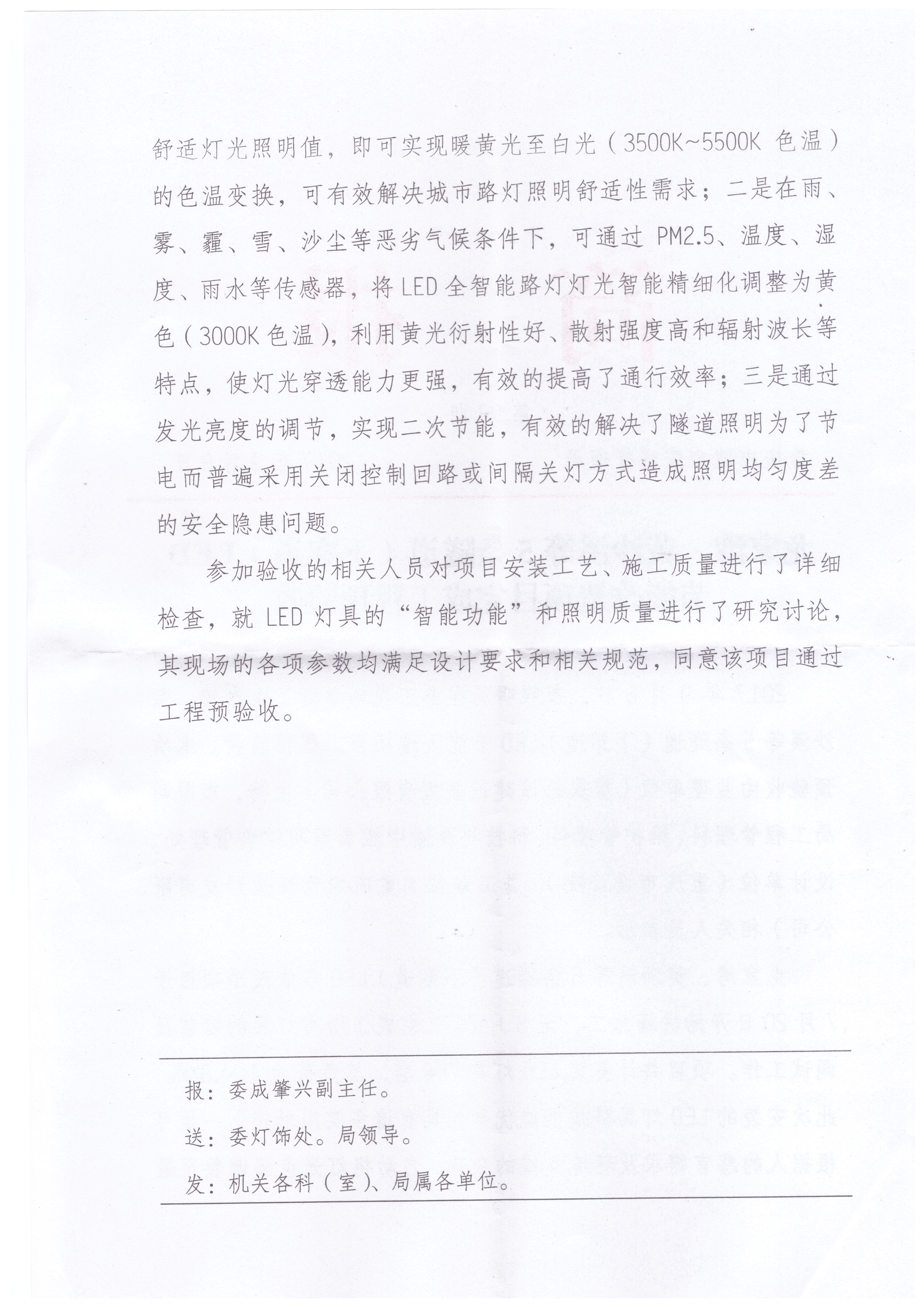 2017年7月31日,我司使用“中國(guó)創(chuàng)造”“互聯(lián)網(wǎng)+”多色溫防霧霾LED全智能路燈在重慶市龍家灣、黃沙溪、袁家崗、鵝嶺、陳家坪隧道實(shí)施科技節(jié)能改造工程已全面竣工。2017年9月6日,該項(xiàng)目建設(shè)單位重慶市城市照明管理局、監(jiān)理公司及設(shè)計(jì)公司對(duì)該項(xiàng)目進(jìn)行了現(xiàn)場(chǎng)預(yù)驗(yàn)收,參會(huì)人員對(duì)該創(chuàng)新專(zhuān)利產(chǎn)品作出了極高的評(píng)價(jià)。會(huì)后,重慶市城市照明管理局專(zhuān)門(mén)印發(fā)了《龍家灣、黃沙溪等5條隧道(下穿道)LED節(jié)能改造項(xiàng)目完成工程預(yù)驗(yàn)收》簡(jiǎn)報(bào)(附后),其上級(jí)主管部門(mén)重慶市城市管理委員會(huì)對(duì)其進(jìn)行了新聞報(bào)道。