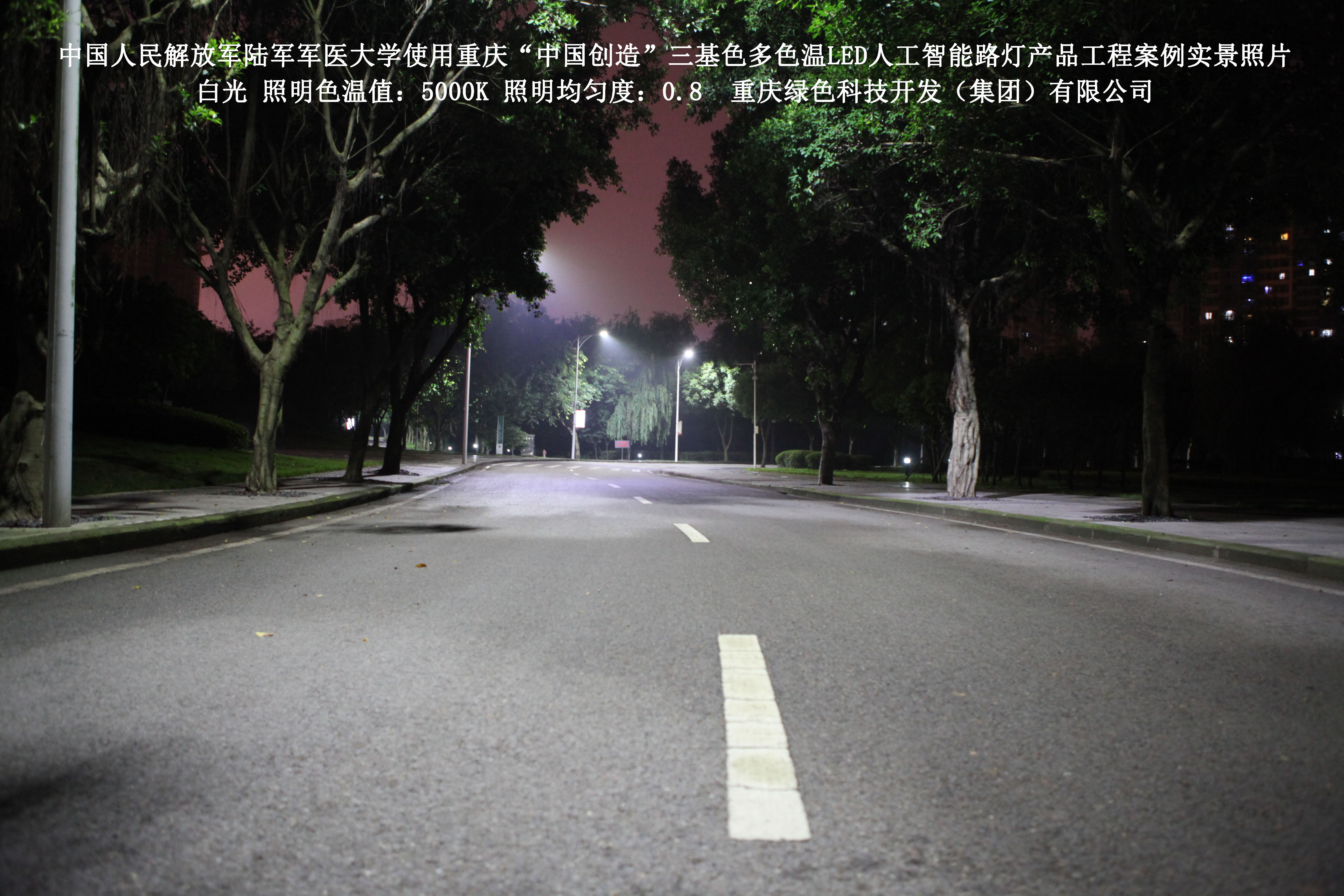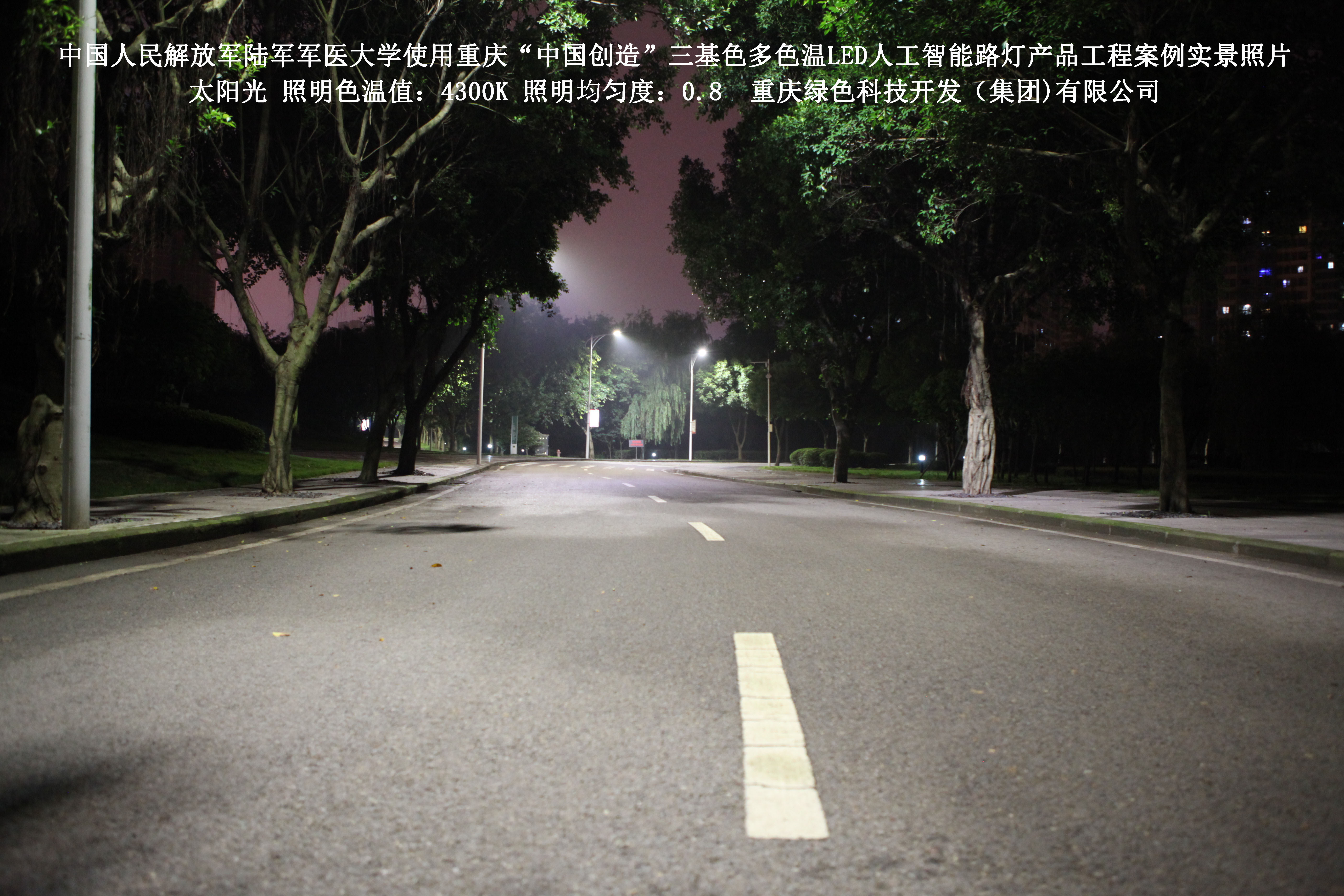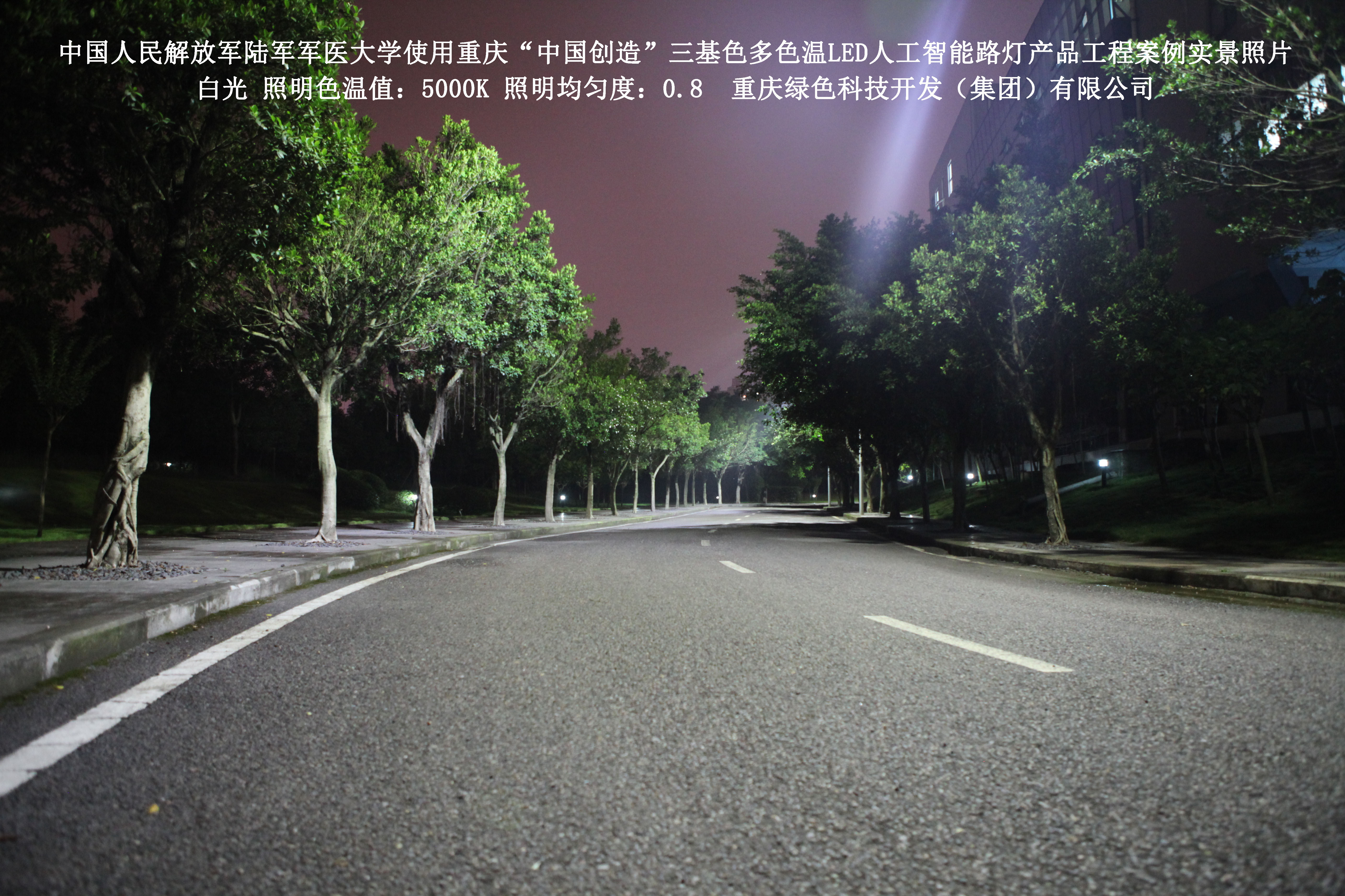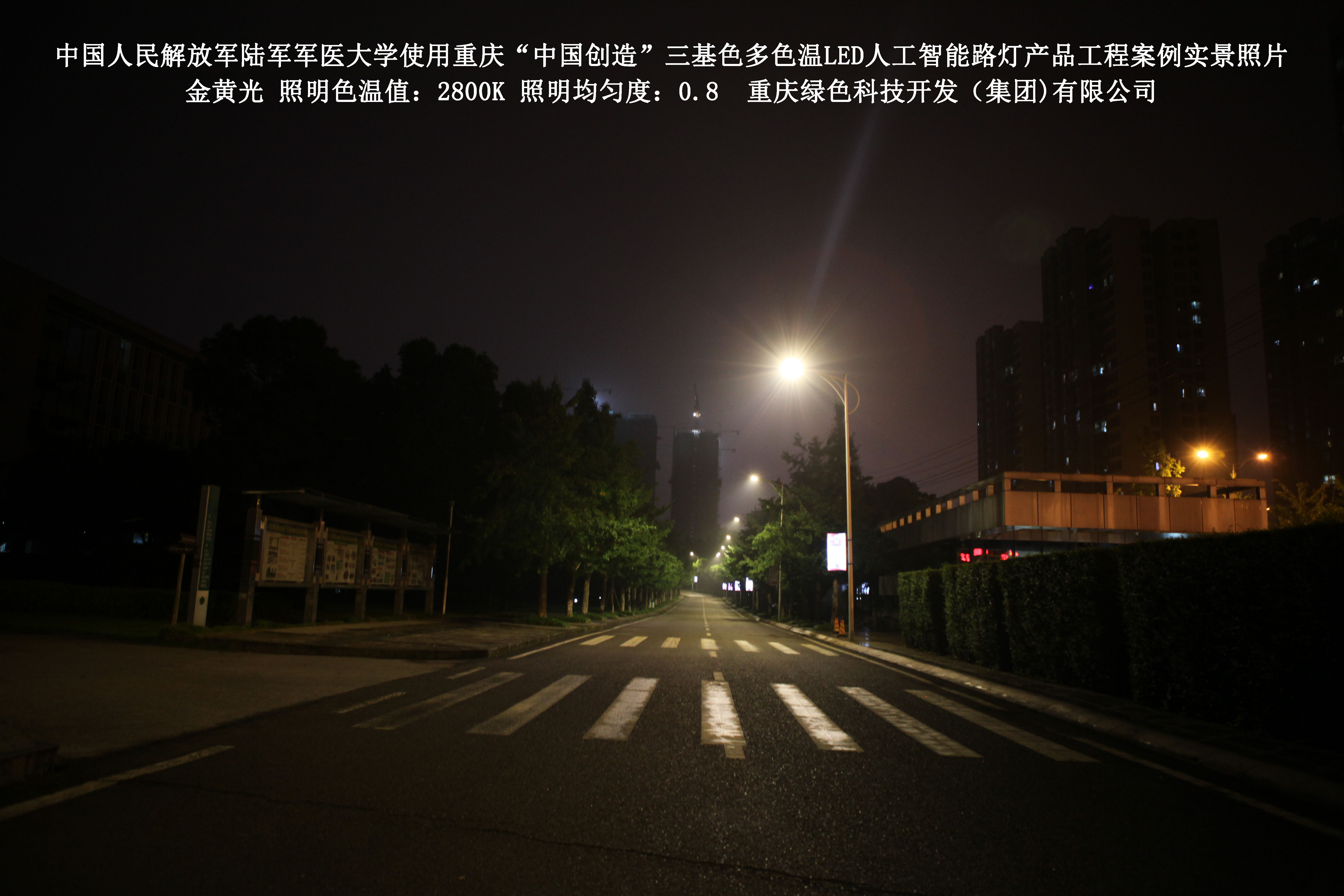 2018年4月,中國人民解放軍陸軍軍醫(yī)大學(xué)使用了我司研發(fā)制造的重慶“中國創(chuàng)造”三基色多色溫LED人工智能路燈,對沙坪壩大學(xué)城校區(qū)道路實施了綠色照明科技節(jié)能改造工程,該工程已全面竣工。工程實施后,極大地提高了照明清晰度、燈光均勻度、舒適度,實現(xiàn)城市路燈照明系統(tǒng)的智能化管理。