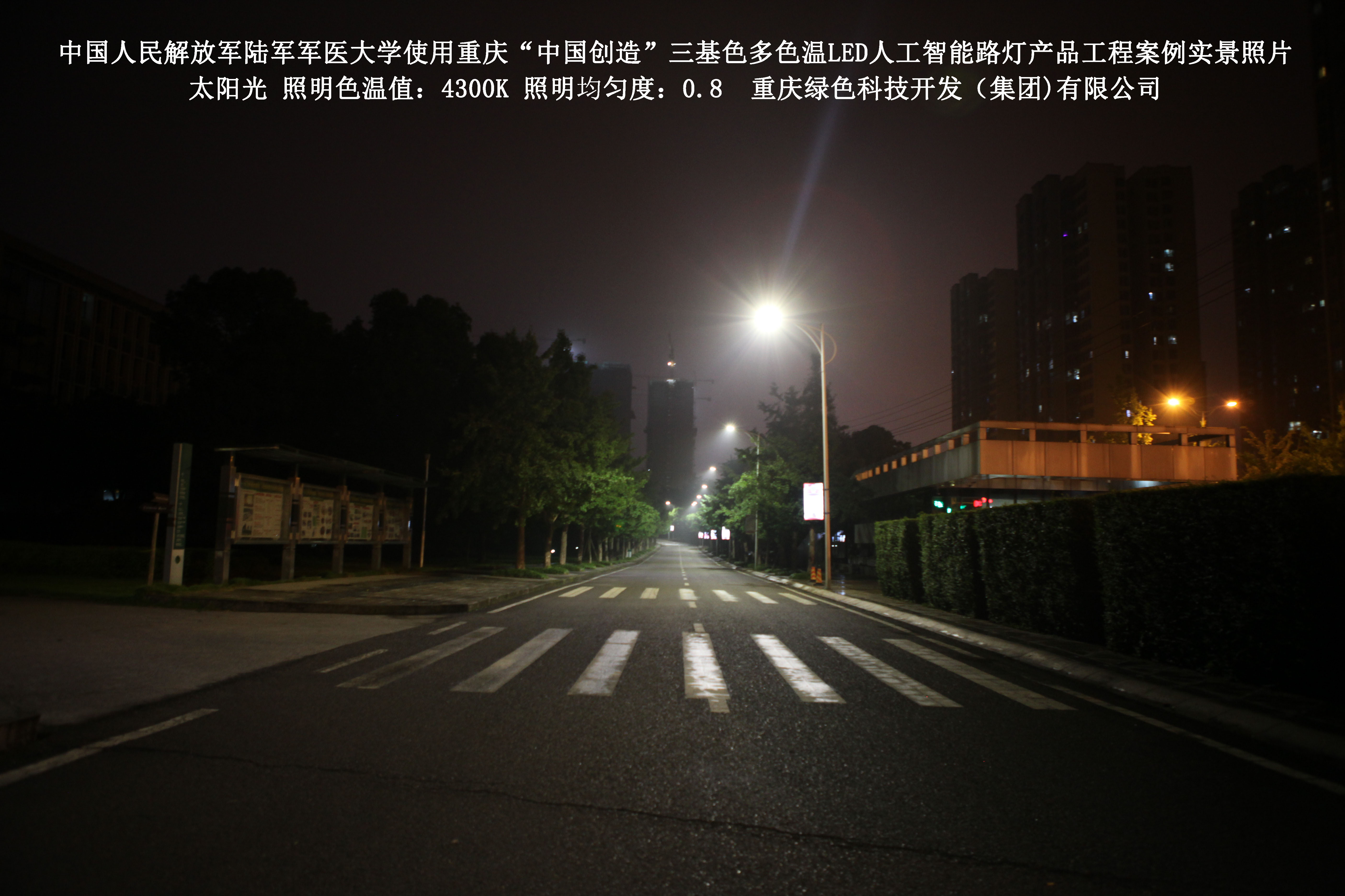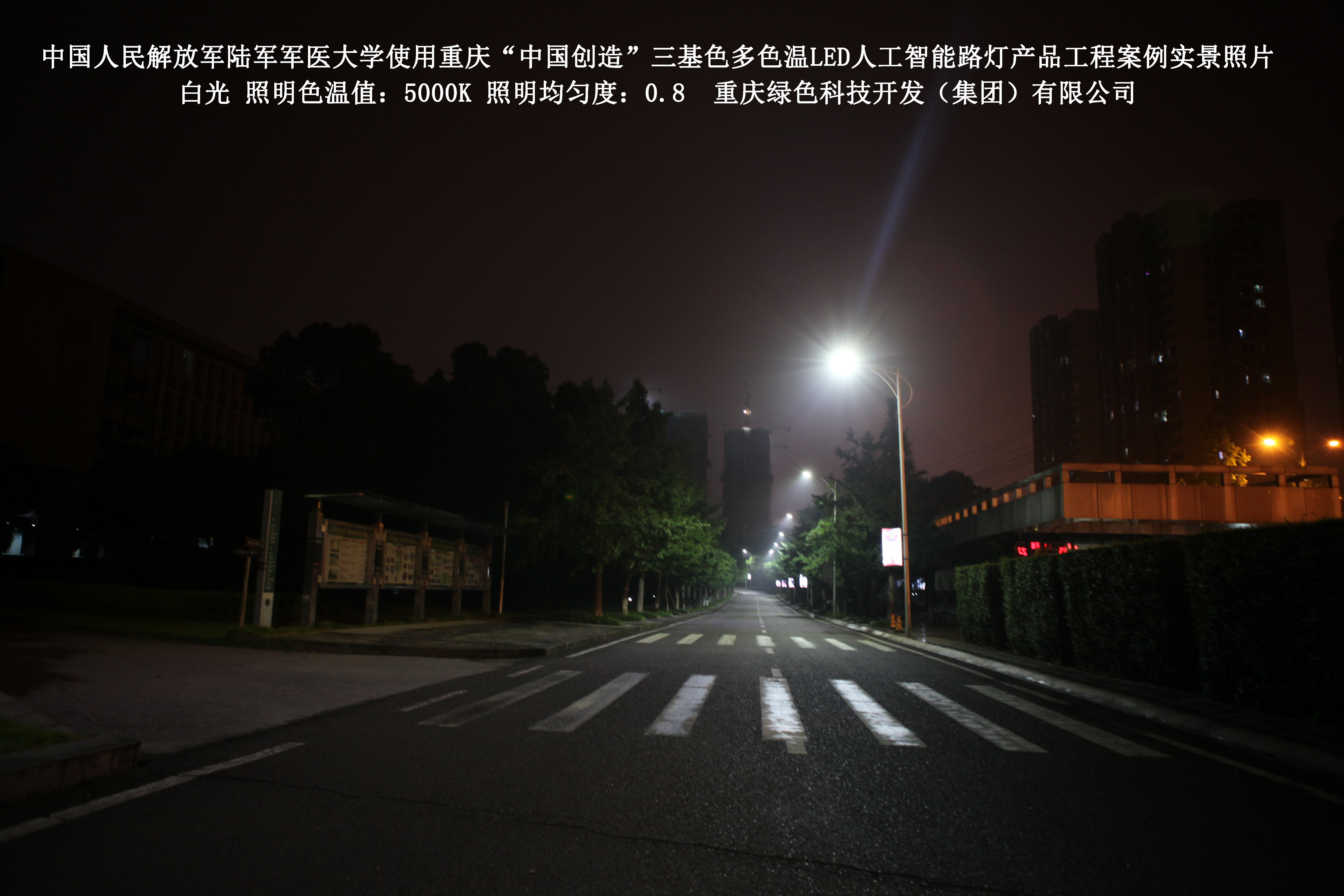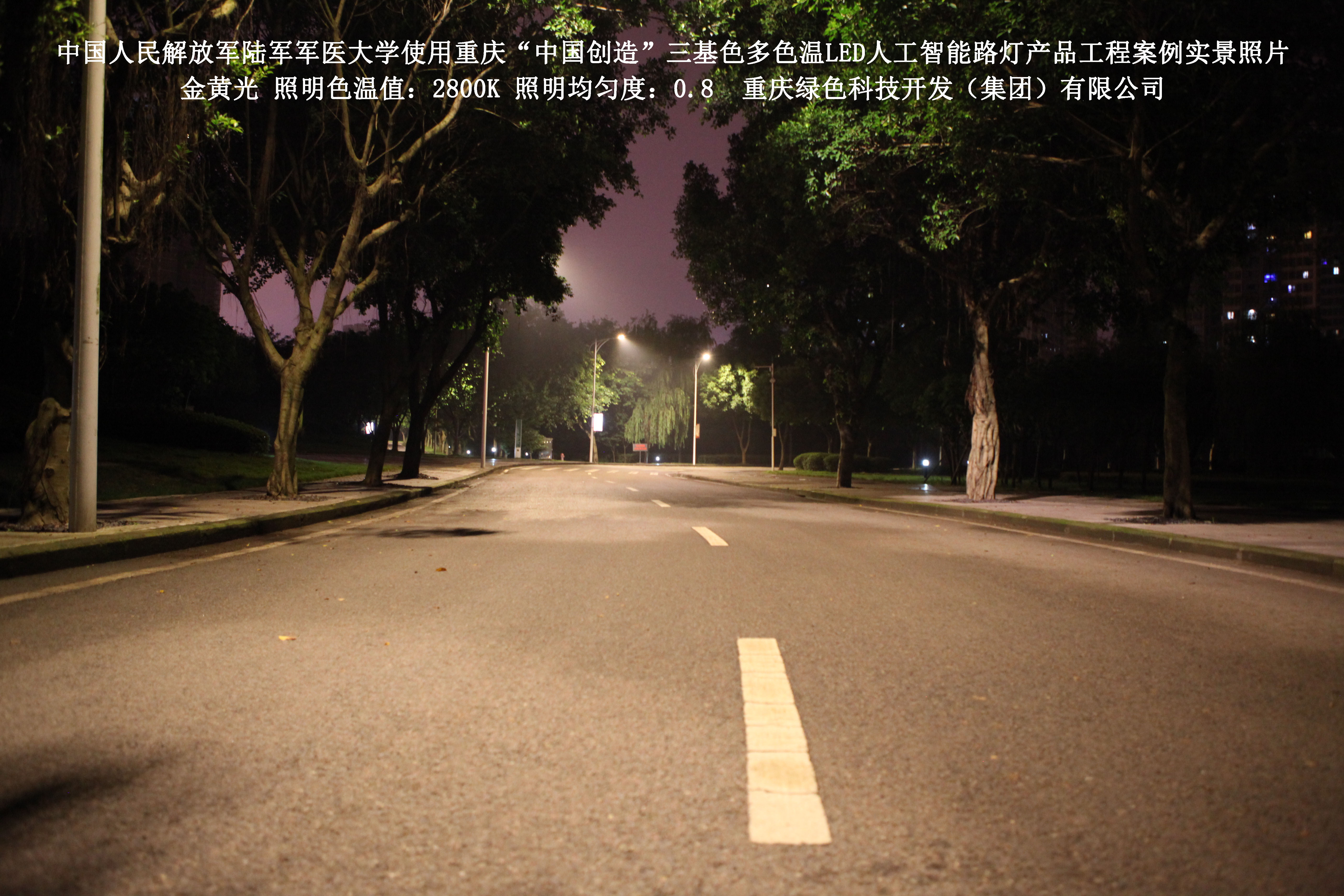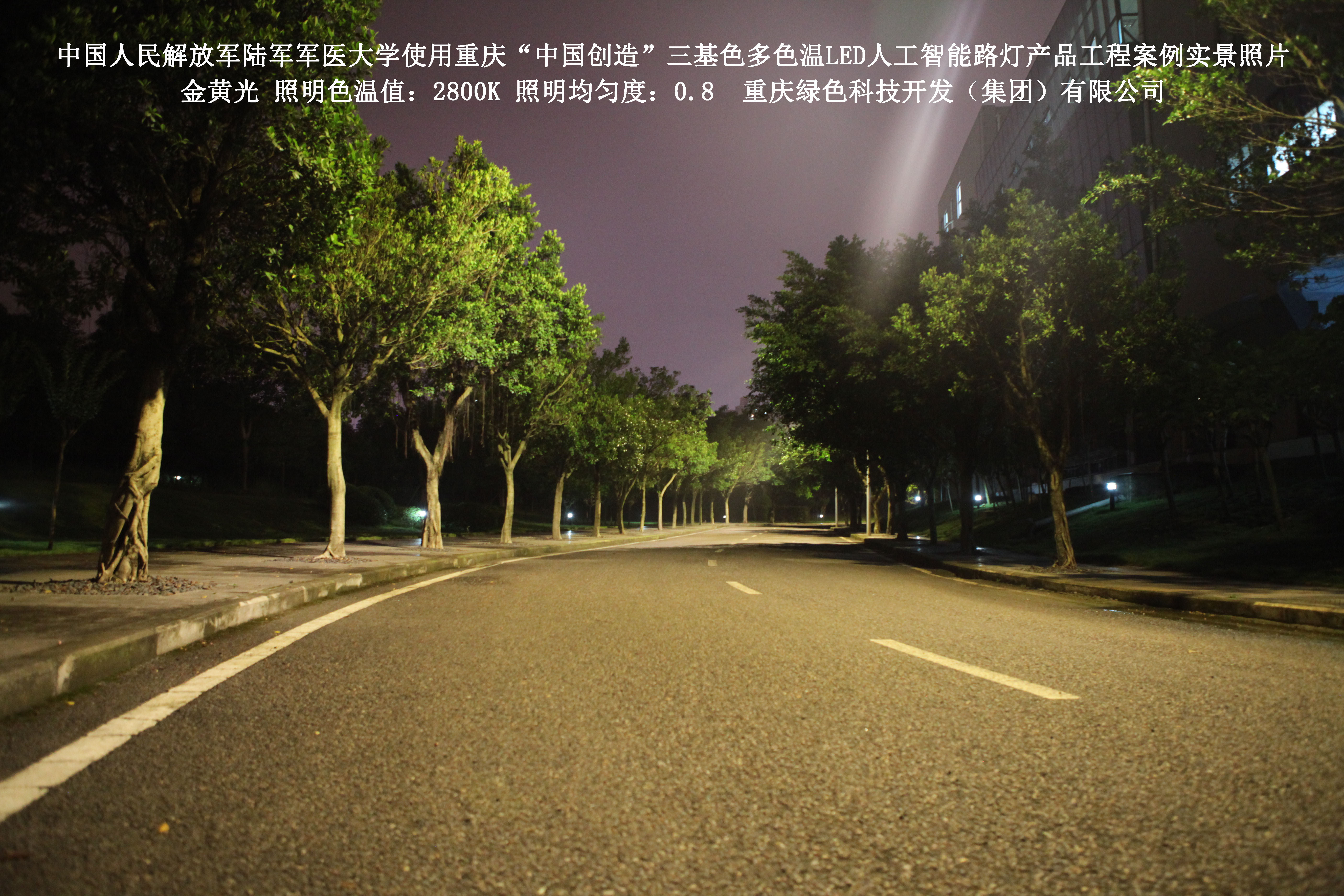 2018年4月,中國人民解放軍陸軍軍醫(yī)大學(xué)使用了我司研發(fā)制造的重慶“中國創(chuàng)造”三基色多色溫LED人工智能路燈,對沙坪壩大學(xué)城校區(qū)道路實施了綠色照明科技節(jié)能改造工程,該工程已全面竣工。工程實施后,極大地提高了照明清晰度、燈光均勻度、舒適度,實現(xiàn)城市路燈照明系統(tǒng)的智能化管理。
