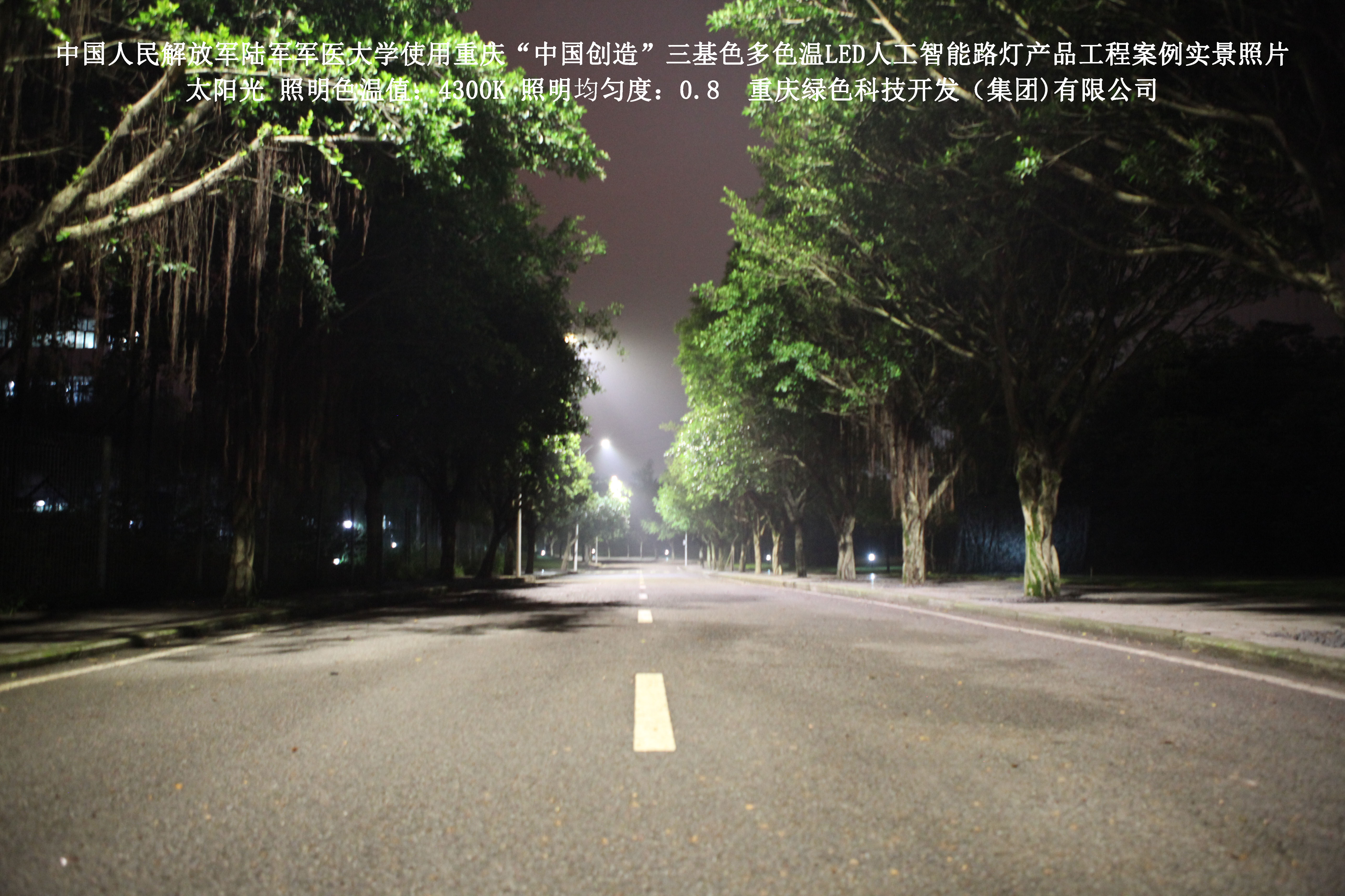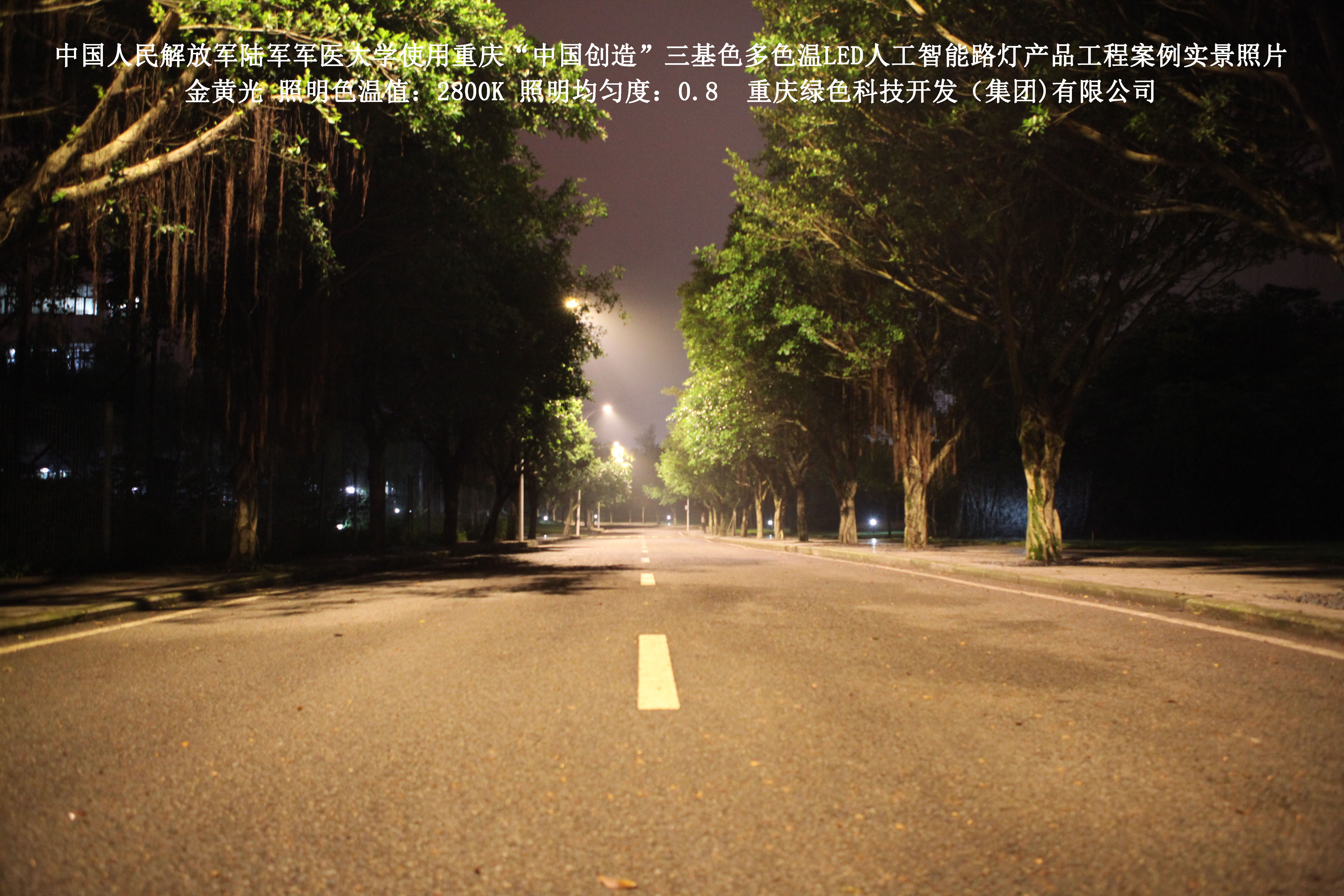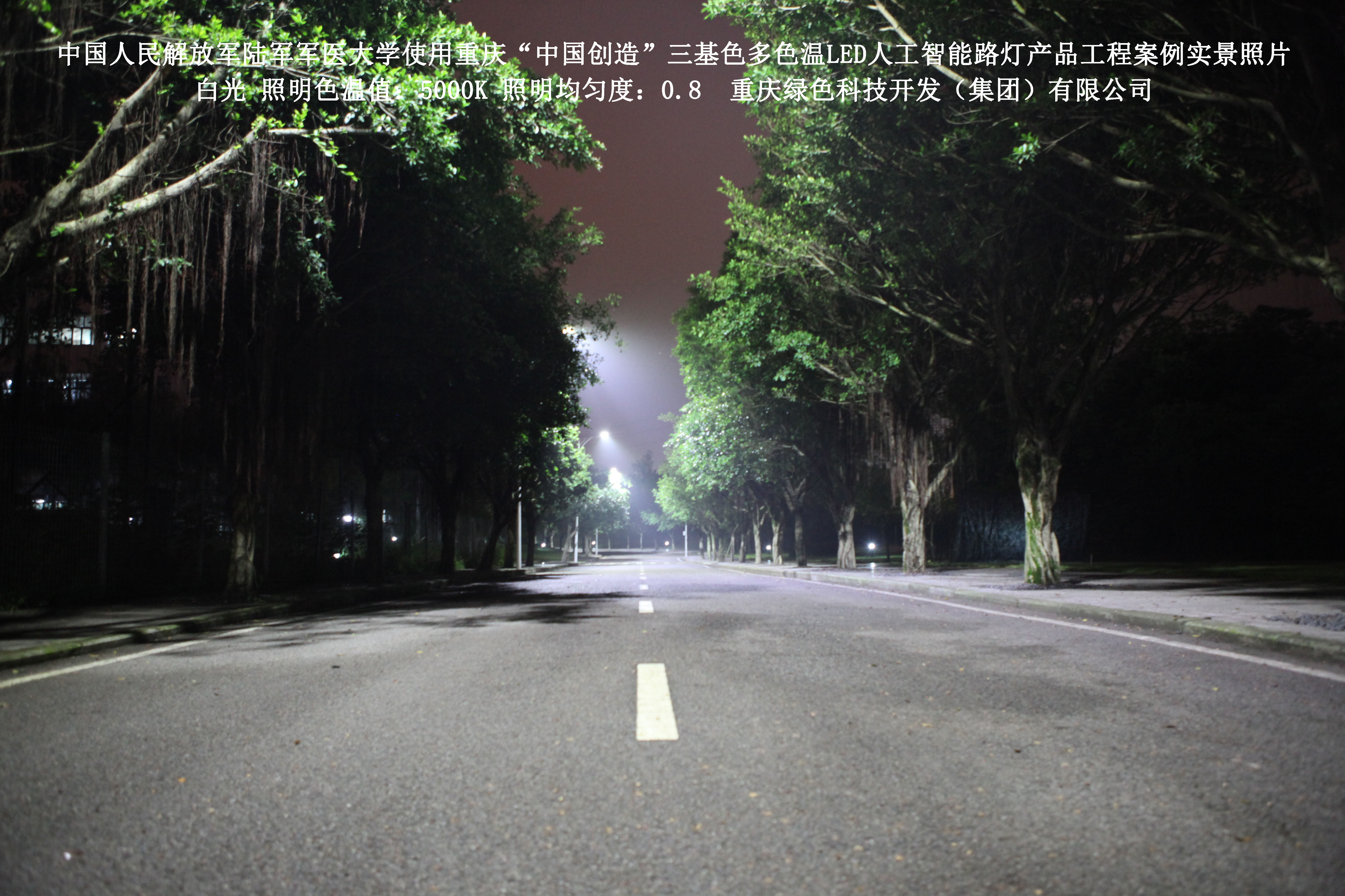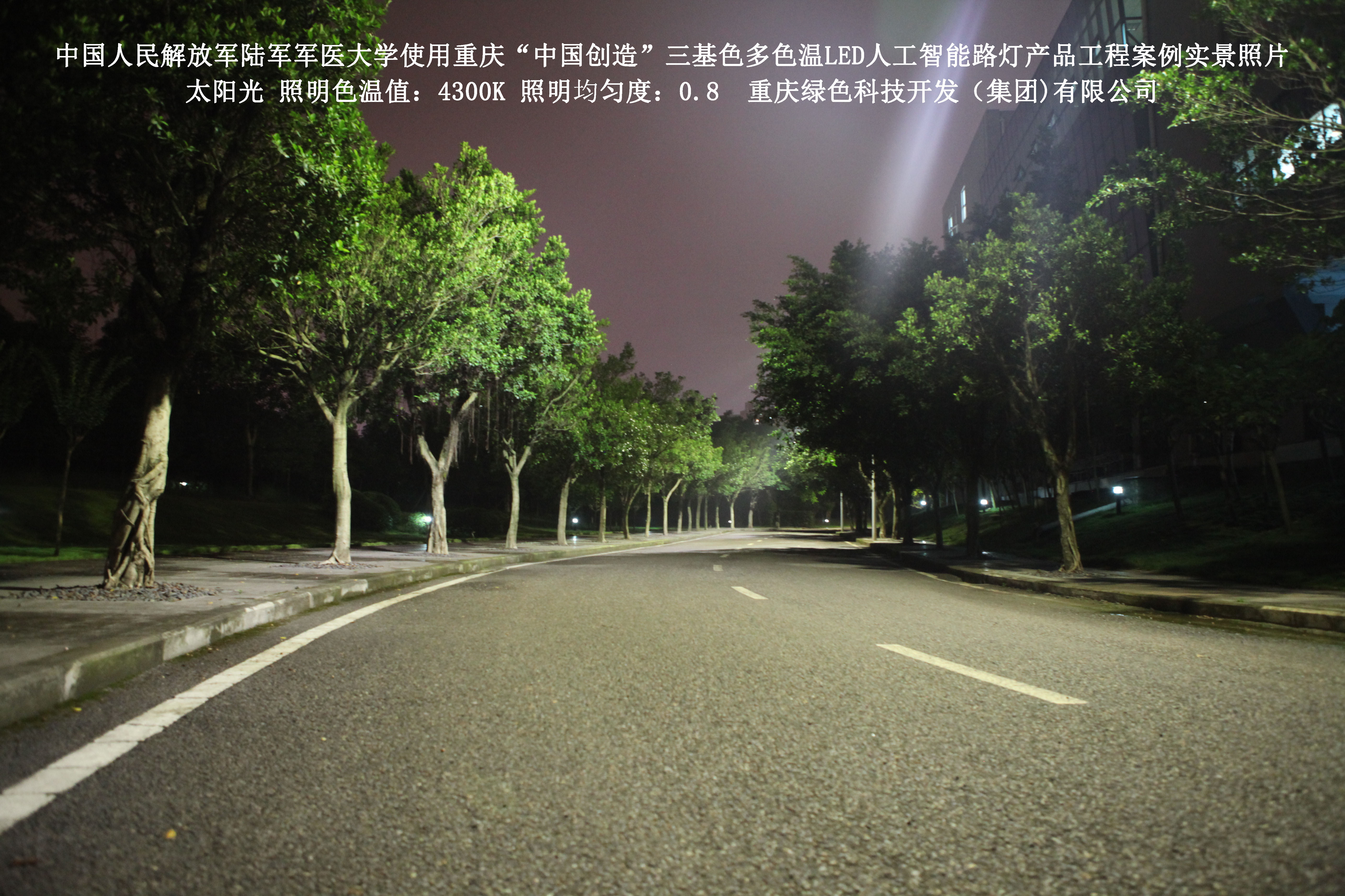 2018年4月,中國人民解放軍陸軍軍醫(yī)大學(xué)使用了我司研發(fā)制造的重慶“中國創(chuàng)造”三基色多色溫LED人工智能路燈,對沙坪壩大學(xué)城校區(qū)道路實施了綠色照明科技節(jié)能改造工程,該工程已全面竣工。工程實施后,極大地提高了照明清晰度、燈光均勻度、舒適度,實現(xiàn)城市路燈照明系統(tǒng)的智能化管理。